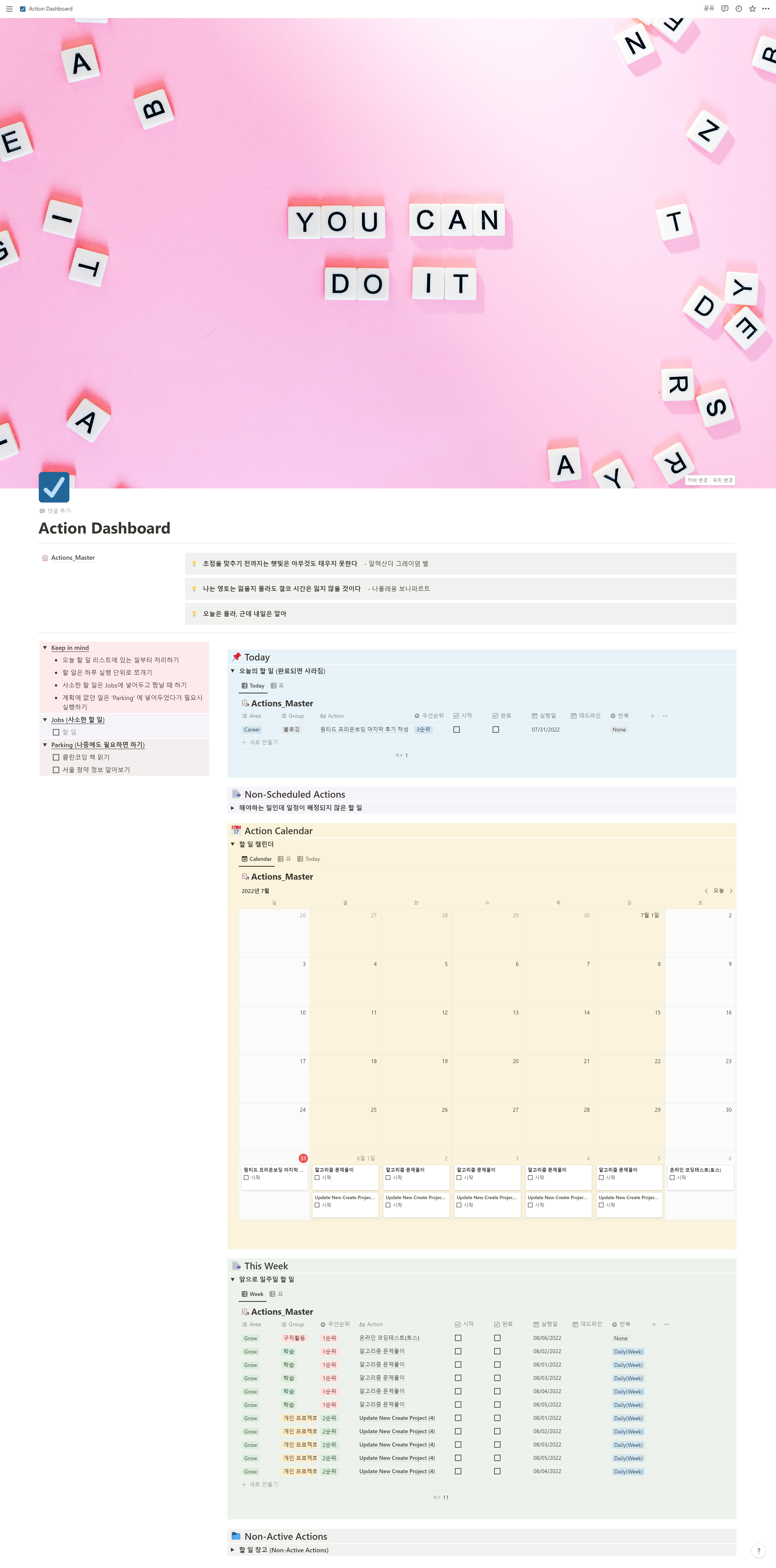 이전에 매일 12시간 이상 공부했던 부트캠프가 끝난 다음 계획을 잘 세우지 못해 일정관리가 안된 것을 떠올리며 이번엔 노션을 활용해 일정, Task 관리를 하려고 한다.