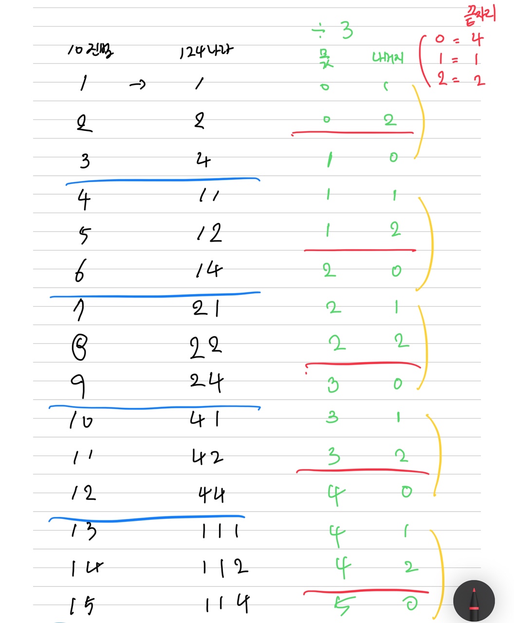 3진법으로 해결은 되지 않았지만 비슷한 규칙성을 찾을 수 있을 거라 생각해서 다시 패드를 꺼냈다.
