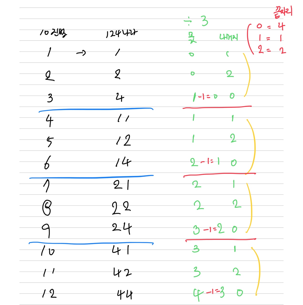 2. 빨간색 규칙 + 파란색 규칙 : 앞의 규칙을 따라가면 나머지가 0이 되는 경우는 앞자리가 제대로 매칭이 되지 않는다. 그 이유는 빨간색 규칙이 파란색 규칙과 일치하지 않기 때문인데 이 부분을 일치시켜주기 위해서 나머지가 0일 때는 몫에서 1을 빼서 규칙을 동일하게 만들어줬다.