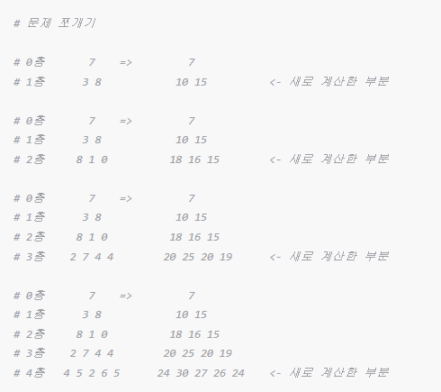 0층의 7은 이전에 더할 층이 없으므로 7이 된다. (계산 로직에서 제외, 코드에서도 0층이 아닌 1층부터 시작한다)