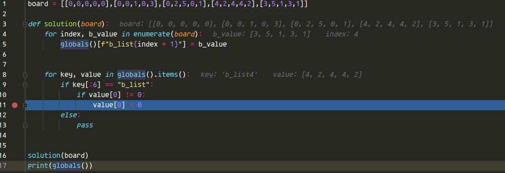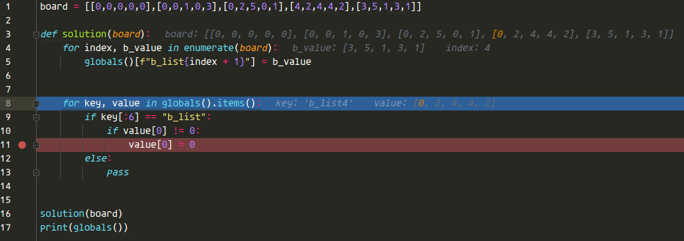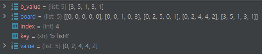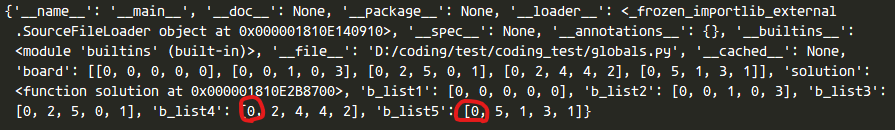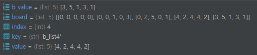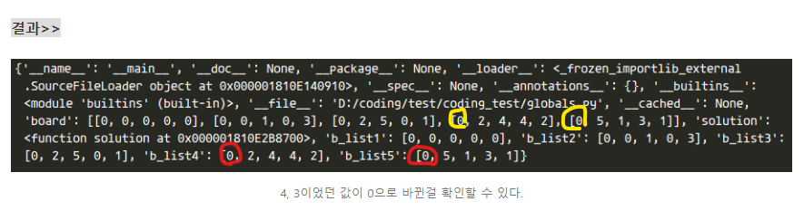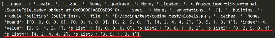 b_list4, b_list5가 수정될 때 board도 같이 수정되는걸 확인할 수 있는데 globals()함수를 사용하면서 서로 매핑되는 상황이 만들어진거 같다.