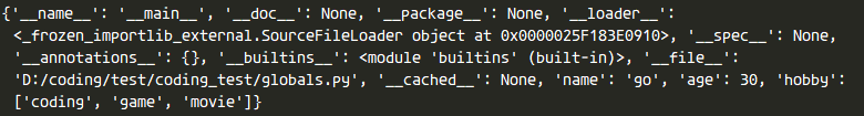 실행 결과 전역 변수들의 정보를 확인할 수 있는데 현재 모듈에 대한 정보 다음으로 내가 설정한 변수 정보도 딕셔너리 형태로 잘 반환되는 걸 확인할 수 있다.