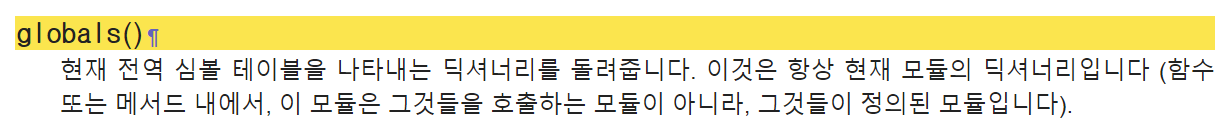 파이썬 내장 함수인 globals() 함수를 간단하게 설명하면 전역 변수의 상태를 dictionary 형태로 보여주는 함수이다.