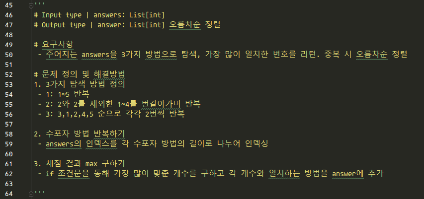 - if 조건문을 통해 가장 많이 맞춘 개수를 구하고 각 개수와 일치하는 방법을 answer에 추가