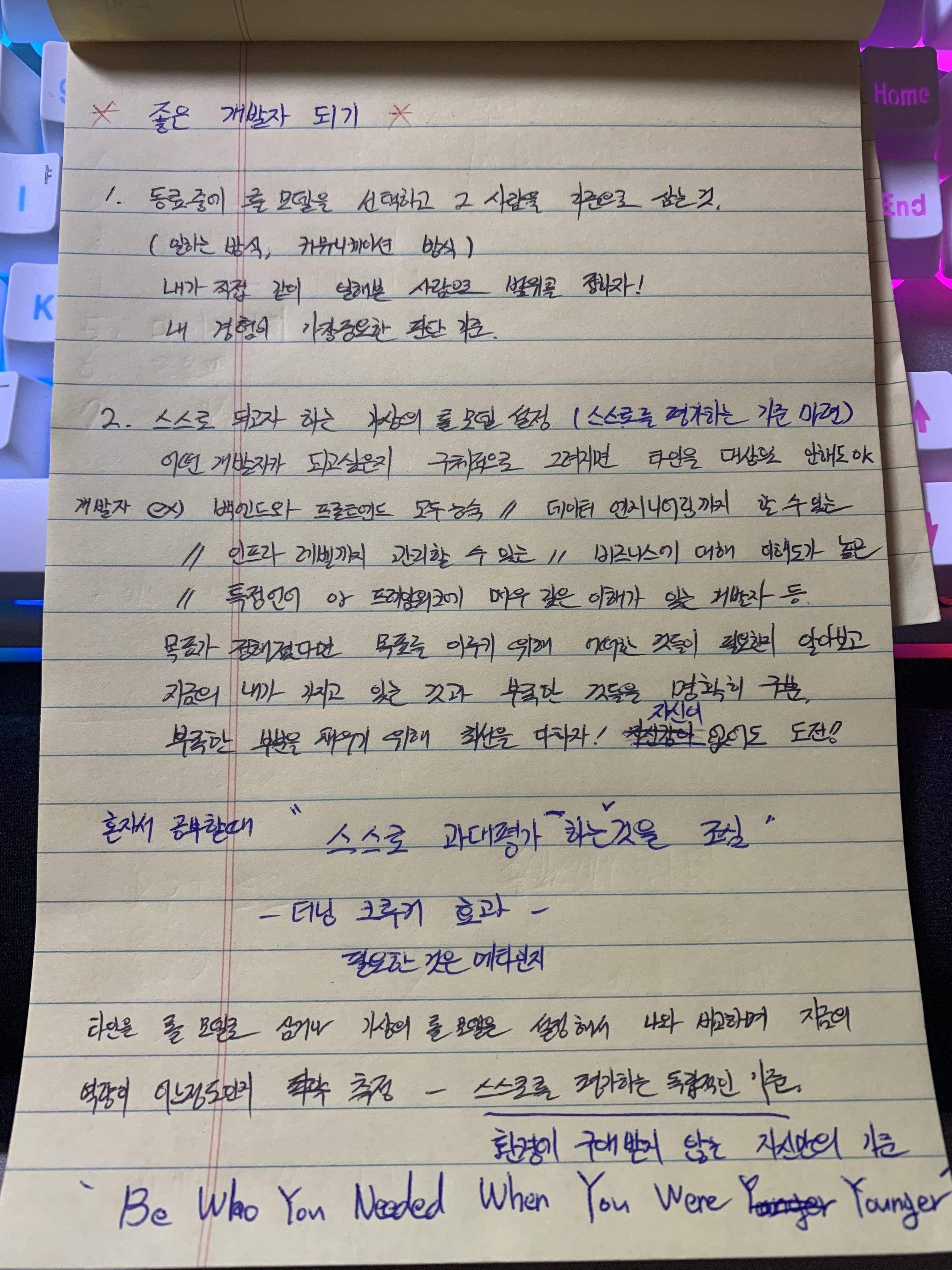 어제 슬랙으로 좋은 글을 공유받게 되어 글을 쭉 보면서 잠시 마음가짐을 세팅하는 시간을 가졌다.