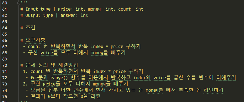 - 요금을 전부 더한 변수에서 현재 가지고 있는 돈 money를 빼서 부족한 돈 리턴하기