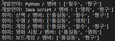 print(f"취미: {hobby} / 멤버: {hobby_members}")